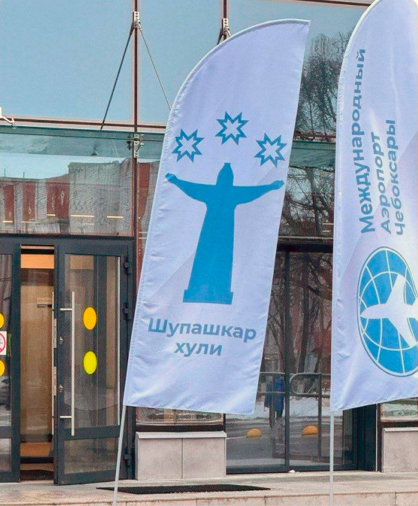 Вот такой флаг-парус стоит у входа аэропорта города Чебоксары. Между прочим, там написано "Город Чебоксары" на чувашском. А совсем не то, что вы подумали.
