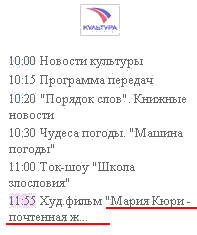 На канале "Культура", сообщила Natalya Goncharova, показывают фильм о Марии Кюри. Но не любят Марию Кюри на канале "Культура", думает Natalya, и мы с ней почему-то согласны...