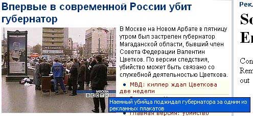 Зевс Громовержец располагает интересными данными об убийстве губернатора. Как выяснилось, убийца поджидал губернатора Цветкова ровно две недели, прячась за рекламным плакатом. Вот это профессионал!