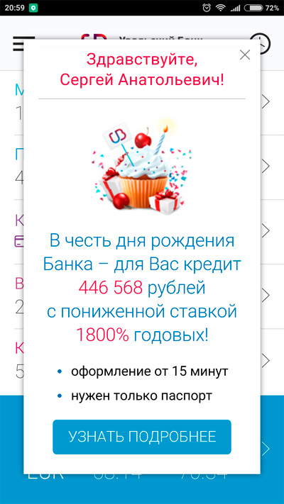 Банк вообще симпатичный, объясняет Сергей, но предложение не сказать что очень заманчивое. Особенно на день рождения. Но хорошо, хоть ставку все-таки понизили, страшно подумать, какой она была раньше.