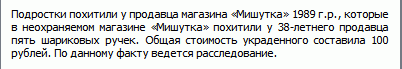 Теперь продавец пять шариковых ручек оказался обокраденным на 100 рублей! Что творится вообще в этом мире, что? И что подростки будут делать с 1989 г. р.? Куда они это денут? Это тяжелые и больные вопросы. На их фоне мы даже не будем интересоваться проблемами и зависимостями журналиста, выдавшего эту потрясающую новость...