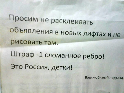 Михаил считает, что расклеивать объявления в лифтах - нехорошо. Страдает здоровье. А потому что это Россия, детка!