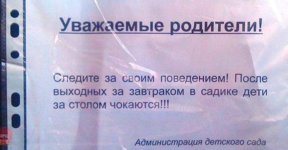 Да уж, родители, сурово заявляет Юрий, следите за своим поведением. А то дети в саду потом чокаются, дрыхнут на диванах, смотрят телевизор и варят борщи.