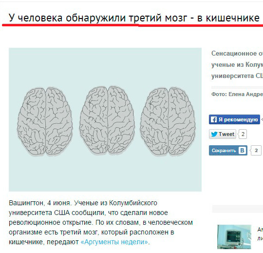 Что интересно, этот дурдом даже перепечатали в паре изданий - где у новостистов мозг тоже в кишечнике: "КМ.ру", на "Дни.ру" и так далее. Причем именно вот с таким заголовком про "третий мозг". Вот точно ни одного мозга не осталось.