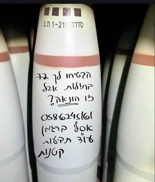 Надпись на снаряде, перевела Алиса: "Тебе обещали 72 девственницы и обманули? Асаф Бергман, адвокат по мелким искам, телефон такой-то".