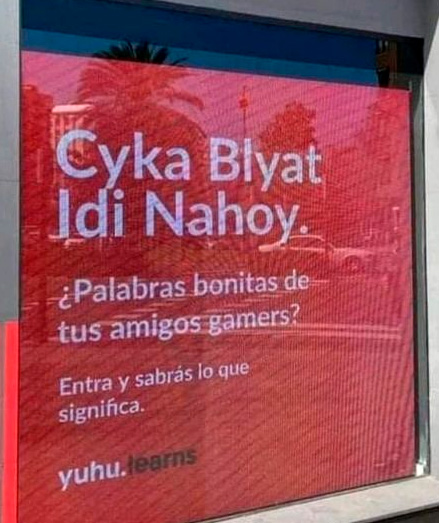 Эффектная реклама курсов по изучению русского языка в Валенсии, рассказал кот Бублик. Надпись на испанском: "Красивые слова твоих друзей геймеров? Зайти сюда, и ты узнаешь, что они означают".
