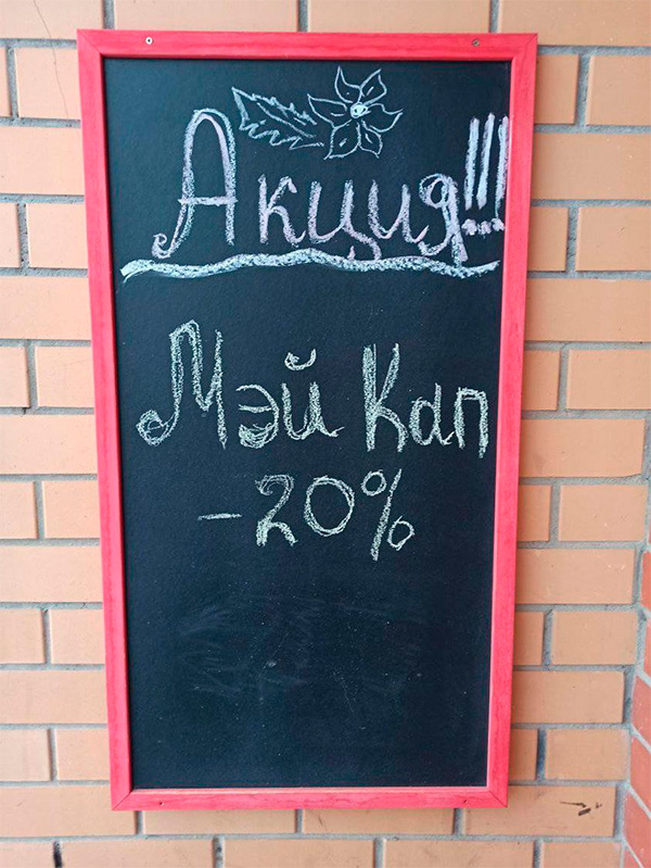 Денис пытается понять, что это означает. Объясняем. "May cap" - это "может, кепку?". То есть скидка на кепку. Скорее всего, бейсболку.