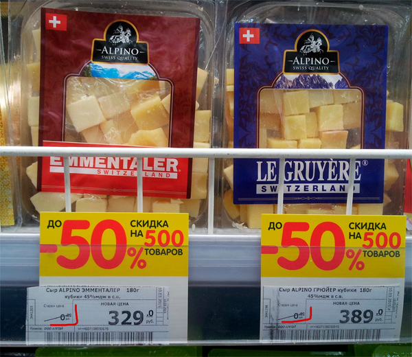 В местном "Перекрестке", рассказал Rtllinux, поняли, что неизбежное увеличение цен на товары народу глаза резанет. Поэтому старые цены просто обнулили. Вот и получается, что раньше народу эти сыры раздавали бесплатно, а теперь скинули аж 50% и теперь он стоит от 300-400 руб. "Многие верят". (с)