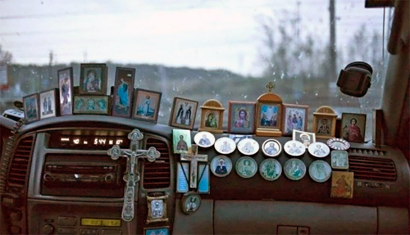 Ну все, теперь ему не страшны ни гаишники, ни аварии! Правда, резина лысая, но с таким иконостасом за резиной следить уже необязательно.