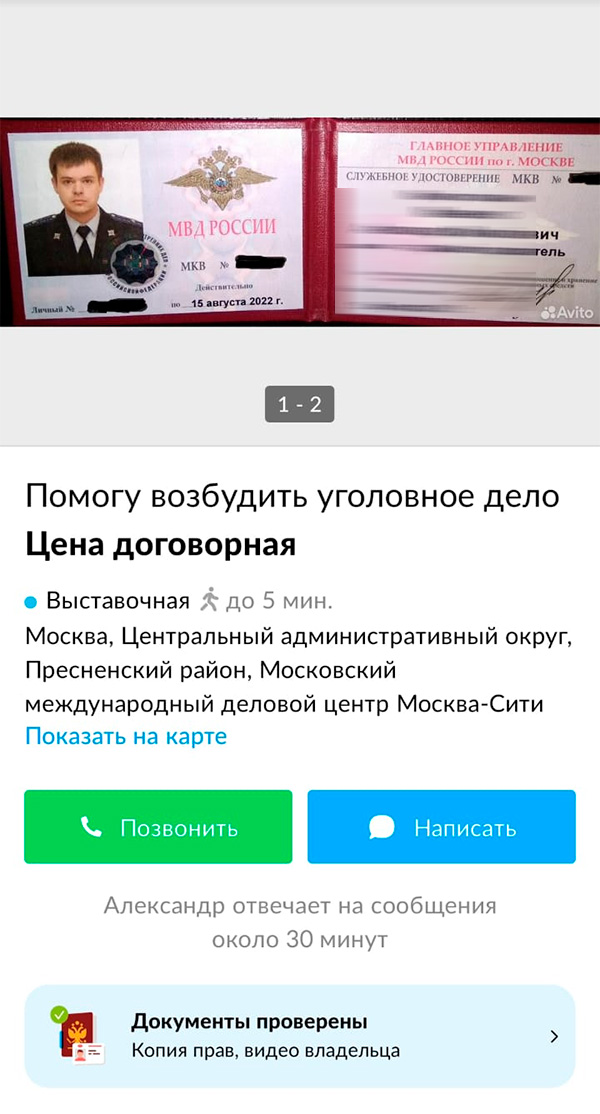 Нет, ну а что: есть спрос - есть и предложение. Надо вам возбУдить уголовное дело - вот вам всамделишный майор юстиции на "Авито". Забашляете - дело будет возбУждено. Именно так в РФ работает так называемое "правосудие". (Прим. Экслера: данные я замазал от греха, на "Авито" они не замазаны.)
