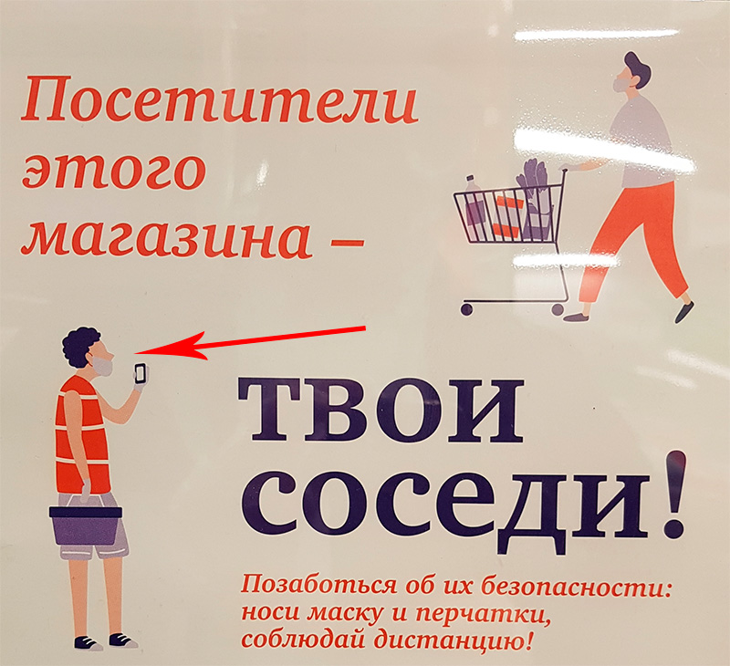 В магазинах "Пятерочка", рассказал Роман, развесили плакаты, призывающие носить маски. На плакате также указано, как именно, по мнению "Пятерочки", правильно носить маску.