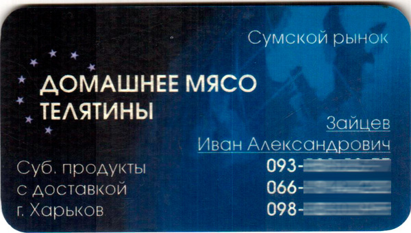 Иван Алексаныч, рекламирует Алексей, предлагает евросоюзовское домашнее мясо на любой вкус: всякие разные телятины, свинины, кабанятины, гусятины и говядины. Прям что хотите. Даже перепелятины есть.