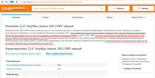 Сергей читает описание ноутбука на сайте "ДНС" и плачет от счастья. Такой ноутбук немедленно хочется купить. Мощнейший процессор, крутейшее разрешение экрана, а главное - дополнительное преимущество имеется! (Кликабельно.)