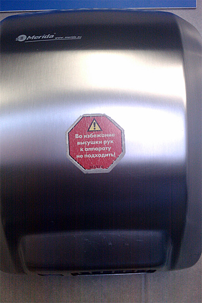 Владимир Н. прислал фото сушки для рук с совершенно психоделической надписью. Прям вспоминается бессмертное: "Кран не открывать! Бежит вода!"