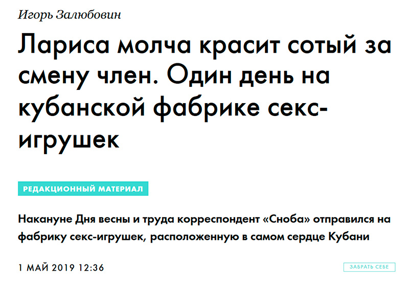 В "Снобе", рассказал Анатолий, чудесный репортаж ко Дню весны и труда. Точнее, ко дню Любви и Труда.