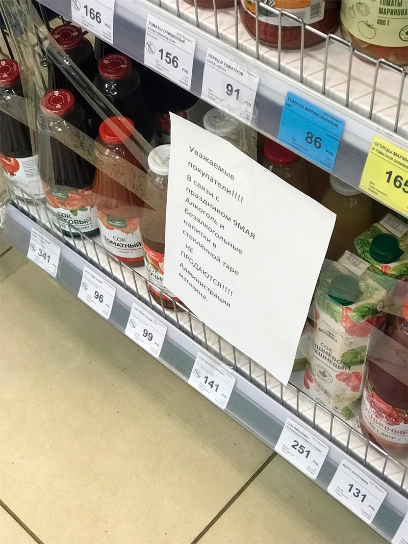 Это еще что, рассказала Лина, вон в подмосковном "Вкусвилле" по случаю 9 Мая алкоголь и другие напитки в стеклянной таре перестали продавать. Видимо, 9 Мая у них уже ничем не отличается от матча "Спартак" - "Динамо".