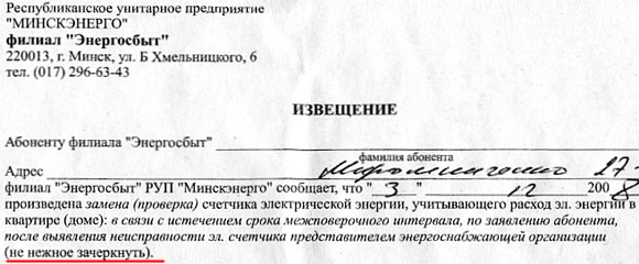 В минском "Энергосбыте", удивляется Руслан, настолько трепетно относятся к клиентам, что требуют от них вычеркивать в извещении все не нежные строчки. Это так трогательно - аж до слез. Тем более что бланк извещения напечатан тиражом в 40 000 экземпляров.