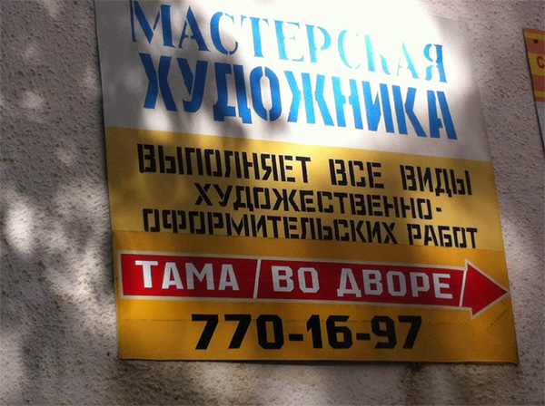 Хотите безграмотные вывески, предлагает Алексей, вам сюда. Именно здеся работает безграмотный художник-профессионал.