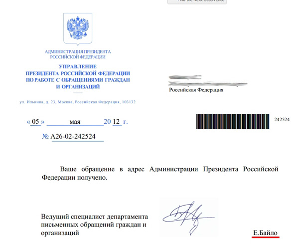 Тем не менее, в Администрацию президента обращаться бесполезно, считает dobandvla. Там такое Е.Байло отвечает...