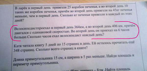 Тем не менее, составить задачу так, чтобы ответом было: 52 часа ехал в первый день, 58 часов ехал во второй день, ехал со скоростью 7 км/час --- это какими же долбоебами надо быть составителям этих задач!!!