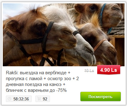 Екатерина нашла на сайте Cherry совершенно потрясающее предложение: выездка на верблюде, прогулка с ламой, двухдневная поездка на каноэ, да еще и блинчик с вареньем! Если при этом еще и предлагают что-нибудь покурить - за 5 лат надо брать, однозначно!