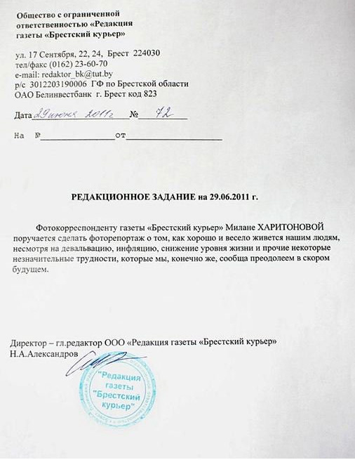Редакционное задание, кстати, совсем даже не смешно. Газета числится в "черном списке" у беларусских властей , думаю, это редакция снабжает своих журналистов для возможности нормальной работы. Задание, кстати,было выполнено, фоторепортаж тут http://bk-brest.by/ru/page/photo_gallery/
