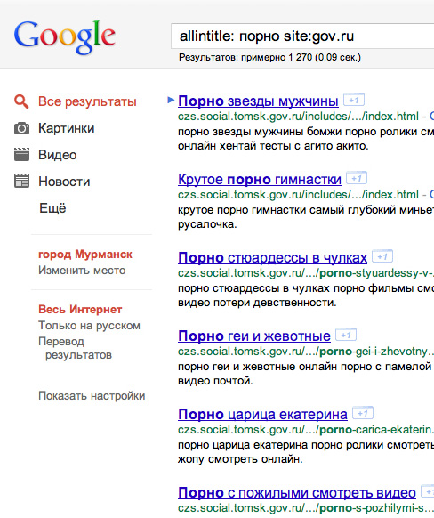 allintitle: порно site:gov.ru - не возвращает ни одного документа. Или уже поправили или одно из двух. 😄