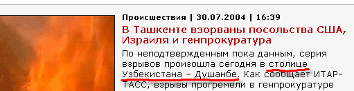Жуткие новости из Узбекистана сообщил Raph! Оказывается, в Ташкенте взорваны посольства США, Израиля и посольство генпрокуратуры! После этого столицу срочно перенесли в Душанбе! Но и в Душанбе после этого произошла серия взрывов - пока не понятно, в каких посольствах. Куда сейчас перенесут столицу - непонятно! Вероятно, в подмосковную Балашиху...