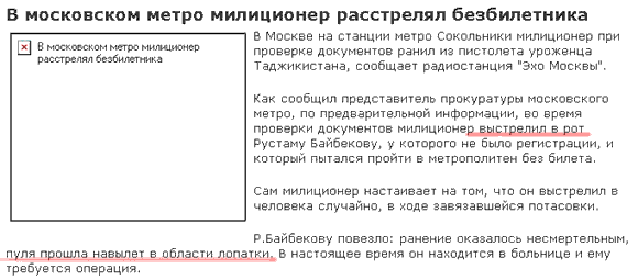 Выстрелил в рот, а пуля прошла навылет в области лопатки. Как такое могло произойти? Или милиционер так хитроумно стрелял, или пострадавший вовремя захлопнул рот, и пуля, одурев в темноте, сослепу не разобрала, где ей нужно покинуть помещение пострадавшего.