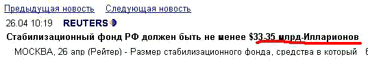 (задумчиво) Интересно, где же они столько Илларионов возьмут? А меньше стабилизационному фонду не годится. Они четко сказали - не меньше 33 миллиардов долларов Илларионов! Короче говоря, надо срочно искать Илларионов и начинать их раскулачивать. Иначе стабилизационный фонд ни черта не застабилизирует!