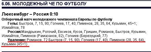 Однако внимательный читатель (это я о себе) сразу увидел, что речь идет вовсе не о чемпионате, а просто о каком-то "че". Вероятно, это соревнования в ЧЕсть ЧЕгевары. Тогда с удалениями все понятно! Пусть Павел скажет спасибо, что их хоть не расстреляли.