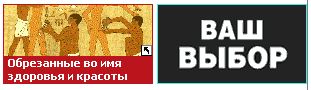 Первая часть баннера понятна. А вот почему так категорично - "ВАШ ВЫБОР"? Может, мы еще не выбрали, а нам уже так сурово сообщают. Я считаю, что рядом с левым баннером должна быть установлена очередная зеленоглазая блондинка, которая лукаво подмигивает и как бы спрашивает: "Тебе уже обкорнали перчик, а?" Вот тогда будет стильно. А так - только народ пугать. Тем более, что на левом баннере изображены какие-то египтяне, прости господи, которые в большинстве своем - давно вымерли.