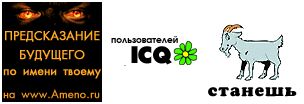 Вот такие дела. Предсказатель, как видно, очень неприязненно относится к пользователям ICQ, которых он называет козлами. Почему? Не очень понятно. Может быть, он через ICQ встретил свою первую любовь, а она оказалась, как водится, сороколетним программером с мозолью на заднице? Вот теперь он злобу на всех пользователях и вымещает. А зря. Пользователи ICQ - вовсе не козлы. По крайней мере, далеко не все - козлы. Среди них встречаются и нормальные эти... как их...