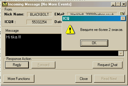 Кстати, об ICQ... Асюшка (хм...) прислала вот такое милое сообщение, выданное этой программой: