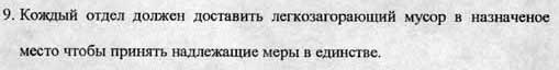 Нормально, да? С другой стороны, все правильно. Вдруг кто-нибудь забудется и начнет проводить огнекасательные работы рядом с легкозагорающим пожарным органом! Кроме того, в единстве - наша сила, и только в единстве мы можем принять надлежащие меры, чтобы доставить легкозагорающий мусор в круглосудочный тефлон пожарного органа. >