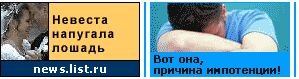 Правда, из баннизма не очень понятно, у кого случилась такая проблема с потенцией: у самой лошади или у жениха. Впрочем, на горестном баннере изображен мужик, так что с лошадью, как я надеюсь, все в порядке. Но давайте теперь выстраивать причинно-следственную цепочку: невеста напугала лошадь, лошадь заржала, взбрыкнула и случайно треснула жениху в причинно-следственное место. Место по причине этого, следовательно, вспухло, заболело и стало причиной последовавшей импотенции. Вот так природа вредит человеку, мать ее в дышло.