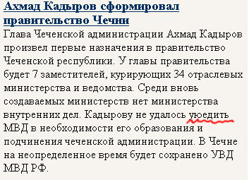 Вот обычный человек нипочем не догадается, что именно не удалось сделать Кадырову. Зато любой фидошник сразу поймет, что Кадыров решил переслать заююканое письмо (письмо в UU-code) в МВД с просьбой о формировании министерства внутренних дел, но гейт письмо с UU-code не пропустил, так что Кадыров остался без внутренних дел. И теперь некому сбегать за пивом и сигаретами.