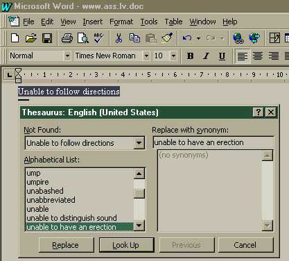 Второй прикол касается орфографии и грамматики Word'а. Но не все знают, что у него еще есть тезаурус! А тезаурус, поскольку это тезаурус Word'а, тоже выдает весьма интересные подсказки: