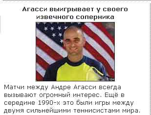 Я так понимаю, что когда-то давно Агасси представлял собой двух разъединенных сиамских близнецов - Андре и Агасси. Ух и долбались они на кортах в середине 90 годов. Однако позже Андре стал себя не очень хорошо чувствовать без некоторых внутренних органов, оставшихся на попечении братца, и попросил вновь воссоединить его с Агасси. Врачи пошли навстречу близнецам и сшили их, как две перчатки. Но привычка-то осталась! Да и посеяны братья под разными номерами. Вот и приходится Агасси играть самому с собой. А вы представляете какая это беготня?