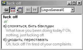 Satanowsky Vadim изучает английский язык. Но не с помощью метода Анжелики Парашкиной, при котором, как известно, язык можно полностью изучить за три дня, прислушиваясь к неслышимому ухом мычанию самой Анжелики с кассеты, а с помощью самой обычной программы Лингво 5.0. Лингво - самый лучший переводчик. Смотрите как она безыскусно трактует термин "fuck off":