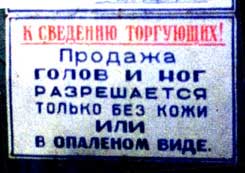 Вот такие жестокие требования предъявляются на одном из рынков. И что делать торгующим? Тем более, что требования сформулированы нечетко. Что, например, значит "без кожи"? Одеваться только в хлопок и синтетику, чтобы Бриджит Бардо не нашла к чему придраться? А кожзаменитель не подойдет? И что подразумевается под "опаленом виде"? Если имеется в виду "опаленном виде", тогда надо четко формулировать, палить ли некоторым горячим восточным мужчинам волосы на пузе и груди, и можно ли оставлять ресницы и брови. Если подразумевается "в палевом виде", тогда надо объяснять, все ли должно быть палевое, или можно надеть белые ботиночки. Короче говоря, жестокие требования, однозначно. Да еще и нечетко сформулированные.