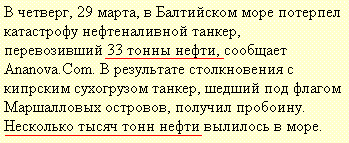 Вы представляете какого уровня достигло воровство нефти на танкере, если он перевозил 33 тонны, а в результате аварии вылилось несколько тысяч тонн?!? Это значит, что все свободные емкости были заполнены ворованной нефтью: бутылки, банки, склянки, канистры и фляжки. Даже в питьевом бачке обнаружилась неучтенная нефть, которая тоже вылилась. Капитану корабля пришлось давать объяснения в пароходстве. "А я фиг знает, - сказал старый моряк, - откуда она взялась, эта нефть. Я-то себе нацедил всего-то пузырек - зажигалку заправлять".