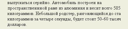 Вы представляете до чего дошел прогресс? За какие-то 50-60 тысяч баксов можно купить тачку, разгоняющуюся до скорости света! Ведь известно, что при приближении к скорости света, масса тела увеличивается. Причем этот родстер до такой скорости разгоняется за четыре секунды! Фантастика! Впрочем, быть может, во время испытания в него просто неожиданно запрыгнул толстый водитель и повлиял на результаты эксперимента?