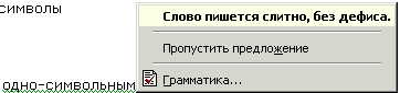 Наш любимый Word, как сообщает Дядя Птеро, уже окончательно с глузда съехал. Сам с собой не может договориться. Вот смотрите. Дядя Птеро в одном из текстов написал слово "односимвольным". Ворд тут же хрюкнул, что, мол, слово надо писать через дефис: