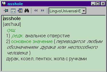 Продолжаем изучать английский язык, вместе с Francis Begbie и уже нам давно знакомой программой Lingvo 6.0. На этот раз изучим перевод не очень приличного выражения asshole:
