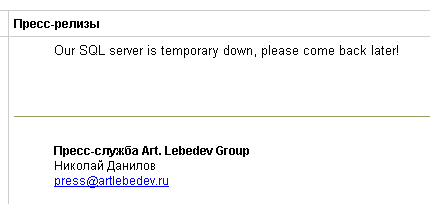 Студия Лебедева продолжает радовать своими пресс-релизами, которые выходит из-под пера знаменитого текстового редактора - Норвежского Лесного. Последний пресс-релиз касается состояния SQL-сервера сайта: