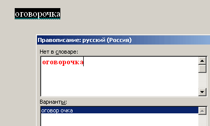 Лену расстроил Word. Уже, казалось, мы привыкли ко всяким "мультиканальным" и "отмелькала", а тут новый шедевр. Вот посмотрите, как он отреагировал на слово "оговорочка":