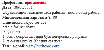 Впрочем, налицо явная описка. Не прогАммист, а прогЕймист. То есть - профессиональный геймер. Собственно, с набором "foxpro for dos и oracle for windows" он никем другим и быть-то не может. Зато он предпочитает играть в бухгалтерские программы и проживать на Хортицком ж-ве. Вероятно, проживание на Хортицком ж-ве - это такая ролевая игра.