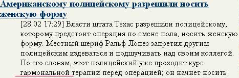- Что за гармональная терапия? - поспешил ответить на вопрос нашего корреспондента Ральф Лопез. - Этому нас научили русские коллеги. Полицейский берет гармонь и визгливым женским голосом поет матерные частушки. Этим мы убиваем сразу двух скунсов: и парень привыкает быть женщиной, и заключенные в камерах перестают буянить, внимательно прислушиваются, а время от времени просят исполнить свою любимую: "Валенки, валенки".