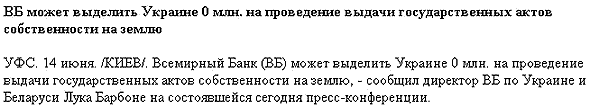- Кроме того, - сообщил Лука Барбоне, - рассматривается также выделение примерно 0 сотен тысяч центнеров пшеницы, 0 десятков транспортов с продовольствием и половины всего нулевого золотого запаса Америки. Однако Белорусь заявила свой протест, поэтому и ей пришлось пообещать 0 млн. долларов кредита. Однако я обещаю, что Украине мы выдадим на 0 млн. больше, чем Белоруси.